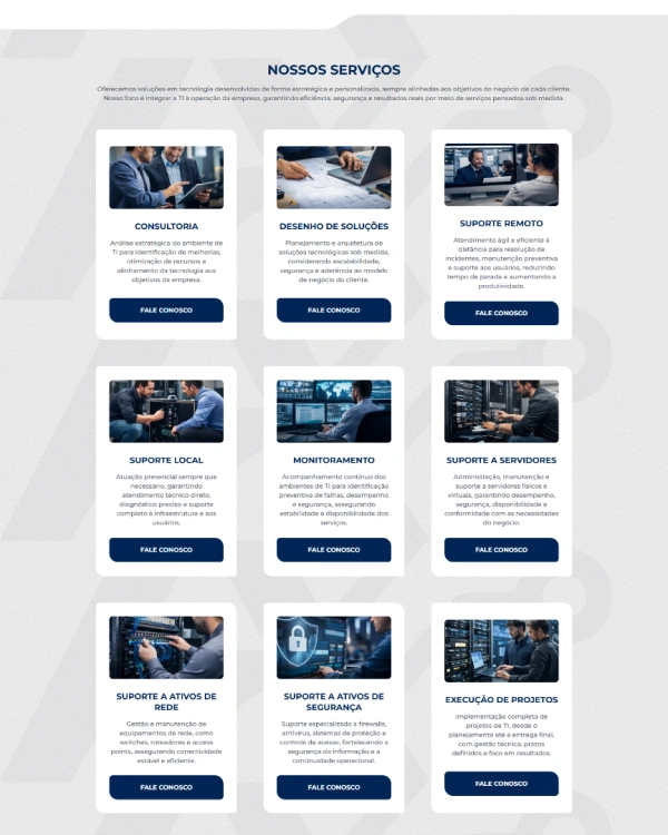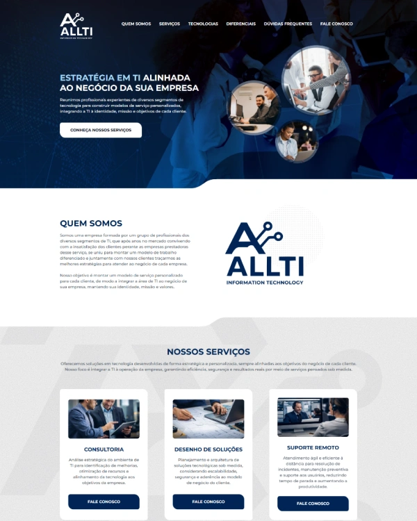 Este projeto teve como propósito desenvolver um site institucional moderno, funcional e orientado para conversão, apresentando de forma clara e objetiva os serviços oferecidos pela All Ti Services. O foco esteve na criação de uma experiência digital leve, responsiva e intuitiva, capaz de transmitir confiança, profissionalismo e credibilidade ao visitante, além de reforçar a expertise da marca em soluções de tecnologia da informação.